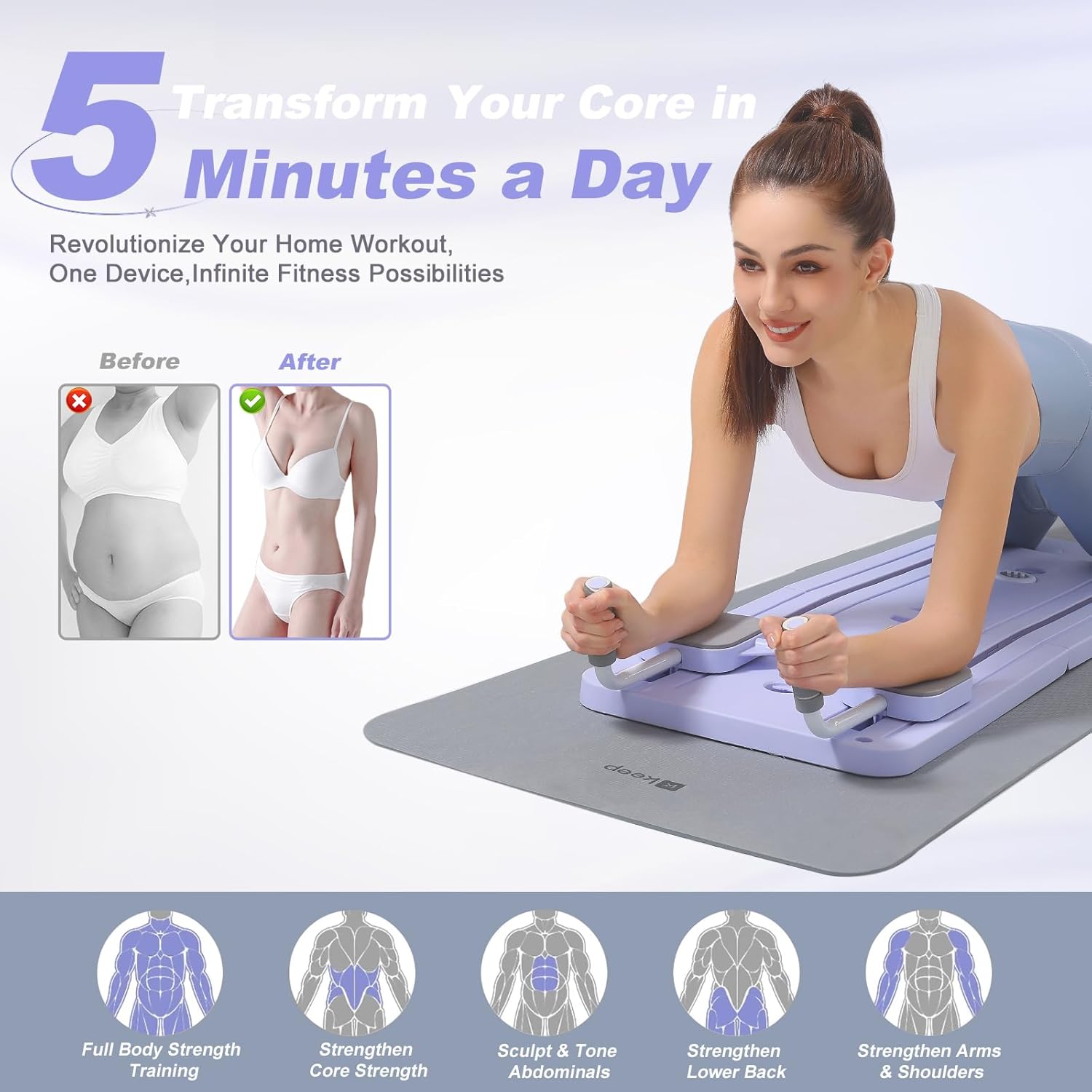 Transform your home workout experience with this multifunctional and compact machine that combines advanced Pilates reformer capabilities and an abdominal board, catering to all fitness levels with over 50 exercise options.